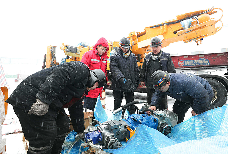 圖片說明:麻地梁煤礦掘進區第二套掘錨成套裝備裝備頂風冒雪進場,組織精干人員開展設備組裝工作。