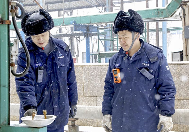 圖片說明:2月3日,寧夏中衛市迎來了強降雪天氣,天寒地凍、白雪飛舞,寧夏潤夏能源化工公司濃硝酸車間三組現場巡檢人員在裝置現場檢查重大危險源硝酸罐區洗眼器出水是否正常。