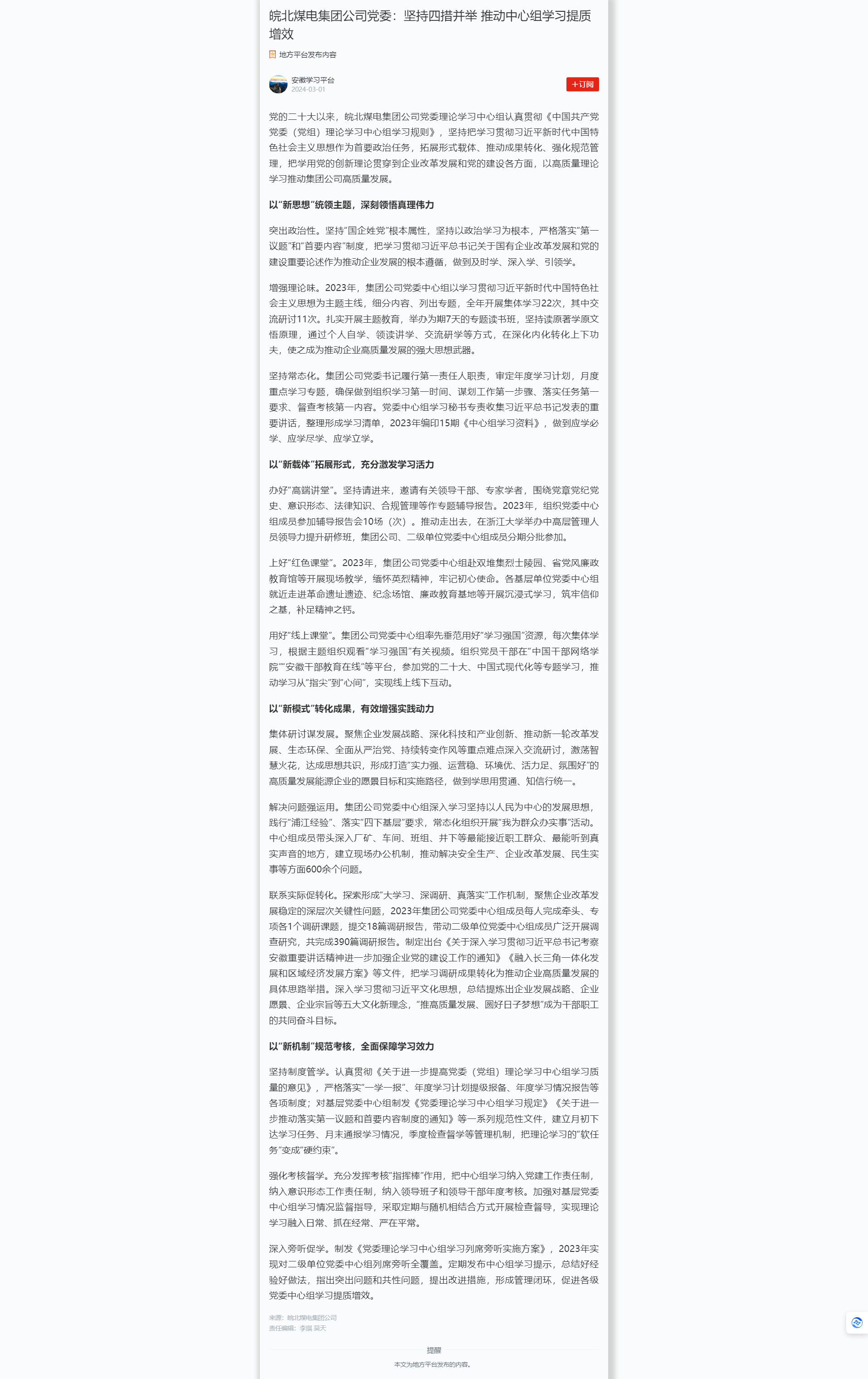 3月1日學習強國平臺:皖北煤電集團公司黨委:堅持四措并舉 推動中心組學習提質增效