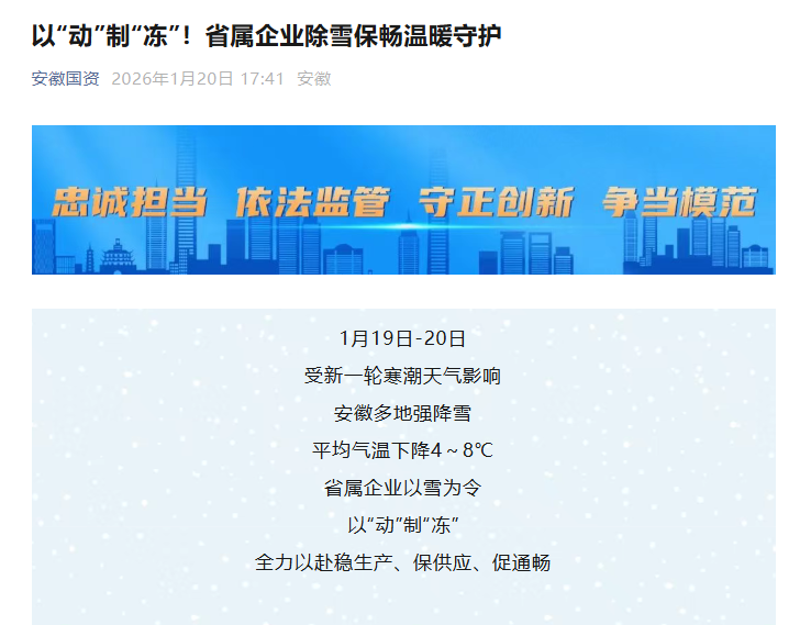 1月20日安徽國資微信公眾號:以“動”制“凍”!省屬企業(yè)除雪保暢溫暖守護