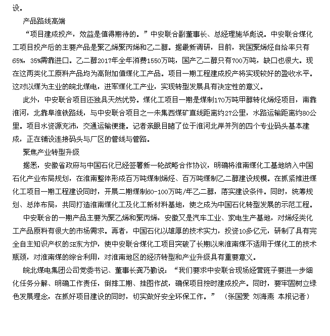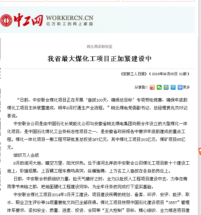 6月5日安徽工人日?qǐng)?bào)頭版頭條:我省最大煤化工項(xiàng)目正加緊建設(shè)中
